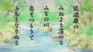 No Monte Tsukuba, Mina (ou Minanogawa no poema) tem sua fonte, para que o fluxo se amplia à medida que desce a montanha. A segunda linha da mina ressoa com mina a partir da terceira linha. A quarta linha de koi significa "amor", mas também "profunda".